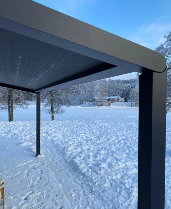 Med sin kraftiga dukspänning klarar den mycket regn, hela 50 liter/m² i timmen vid en lutning på 8°. Fronten på pergolan är försedd med vattenavrinning och lövsil, där vattnet leds vidare ner i stolparna. Kurt går även att montera ovanpå befintlig pergola med en lutning från 7-20°.